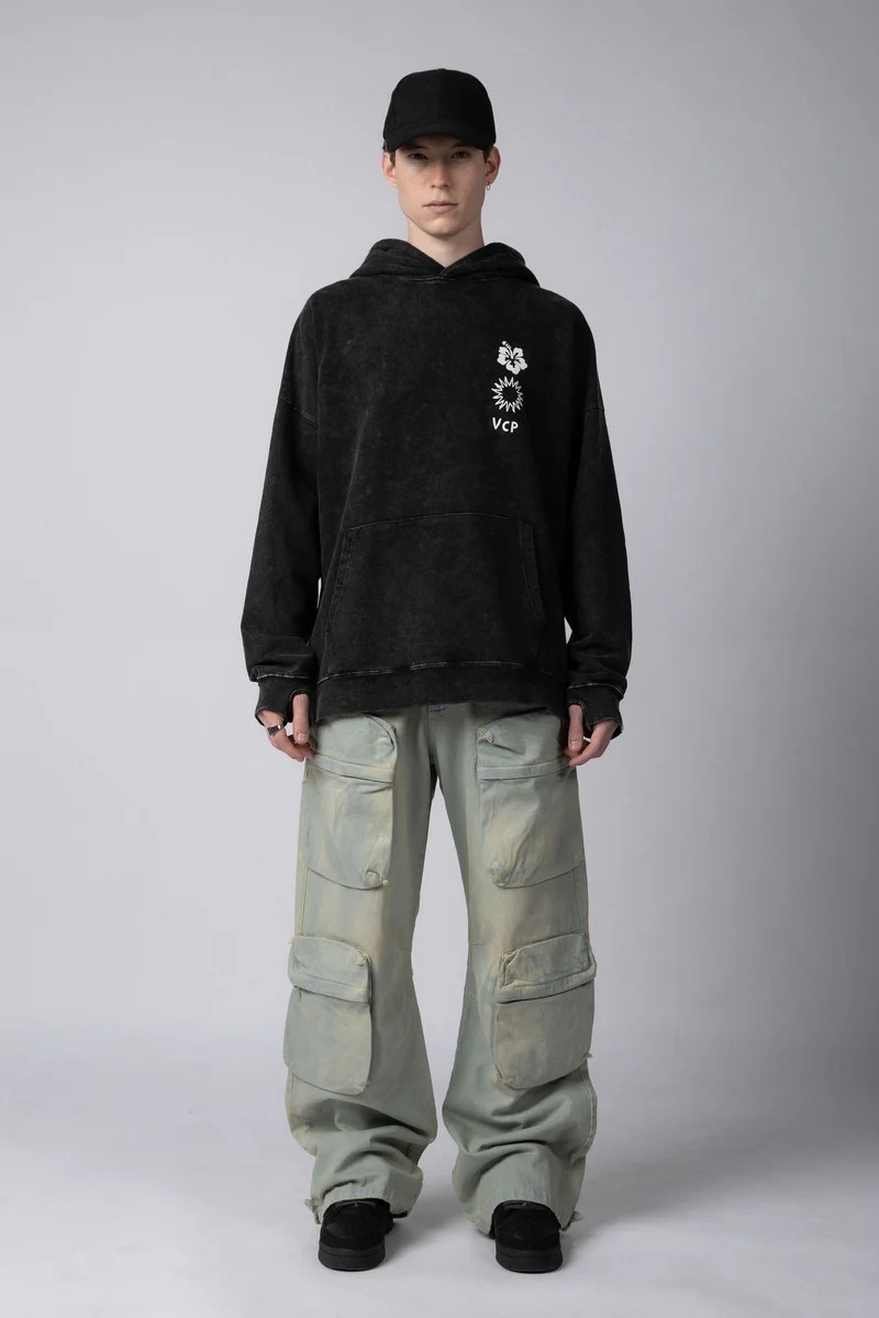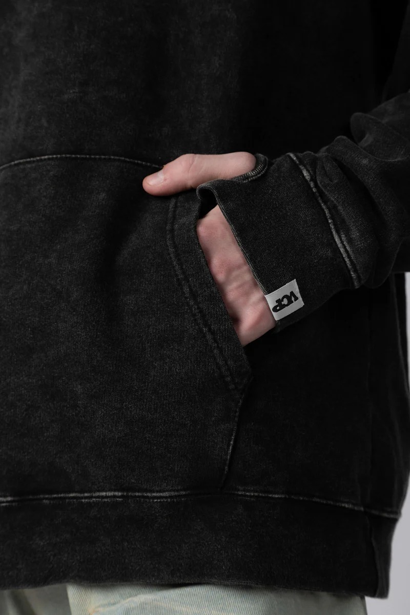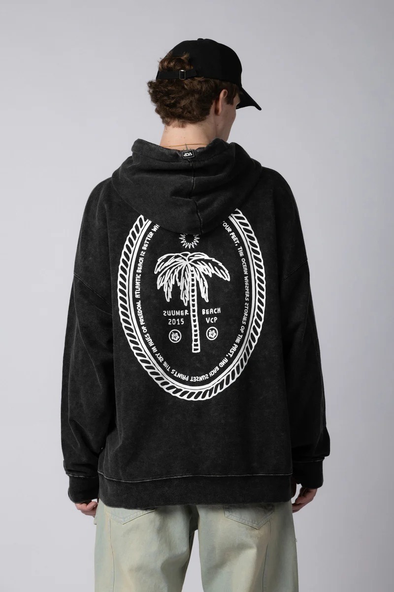 Buzo Canguro de tela rustico con proceso de teñido artesanal y estampado (frente y espalda). Calce oversize. Algodón.