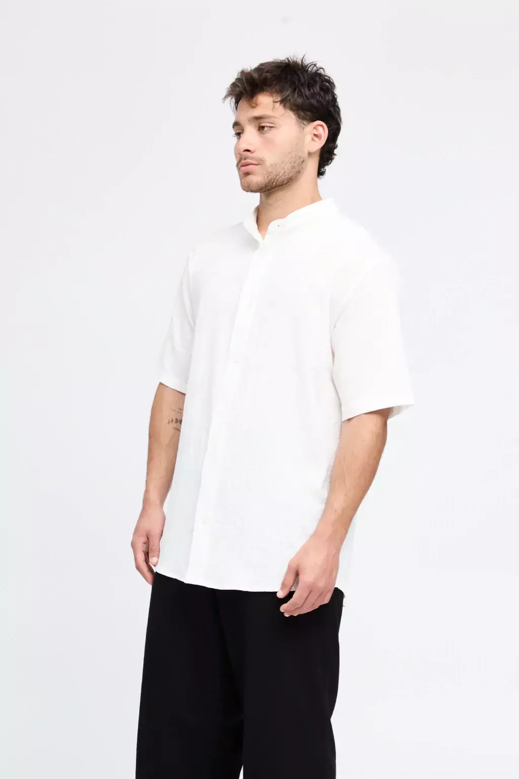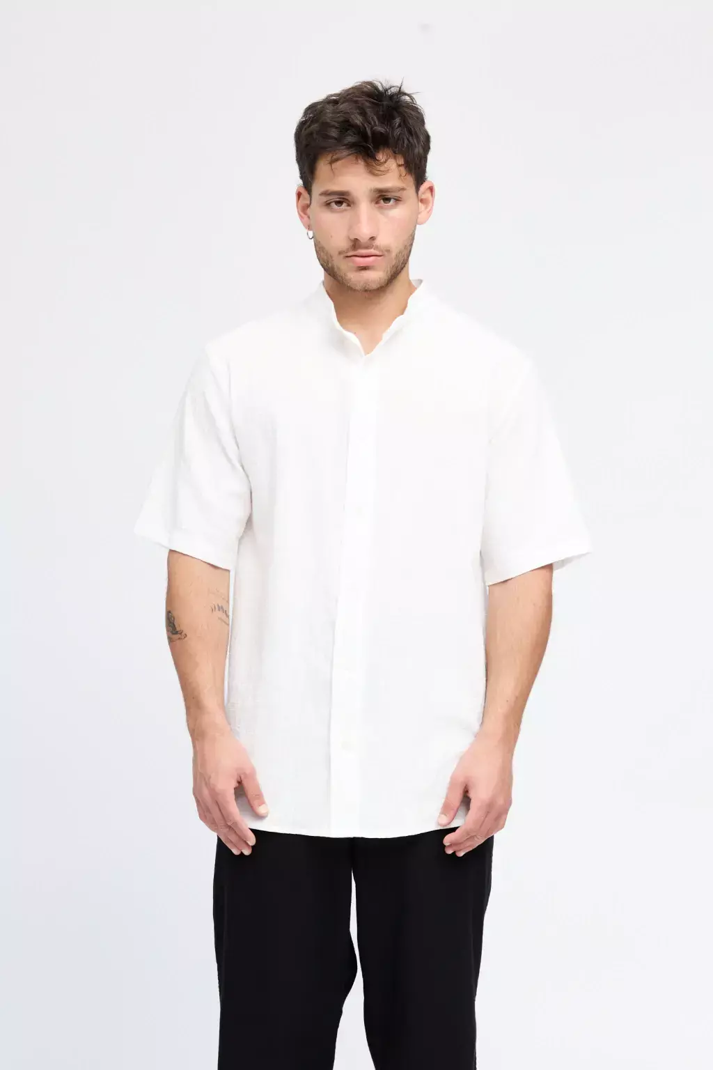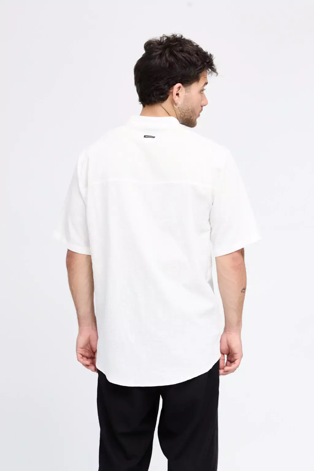 Camisa manga corta con cuello mao, confeccionada en simil lino. De textura fresca y liviana, con cierre de 5 botones a tono.