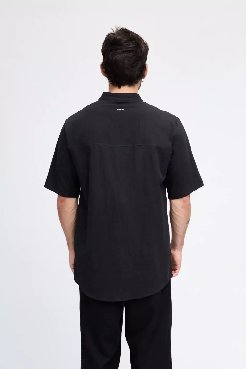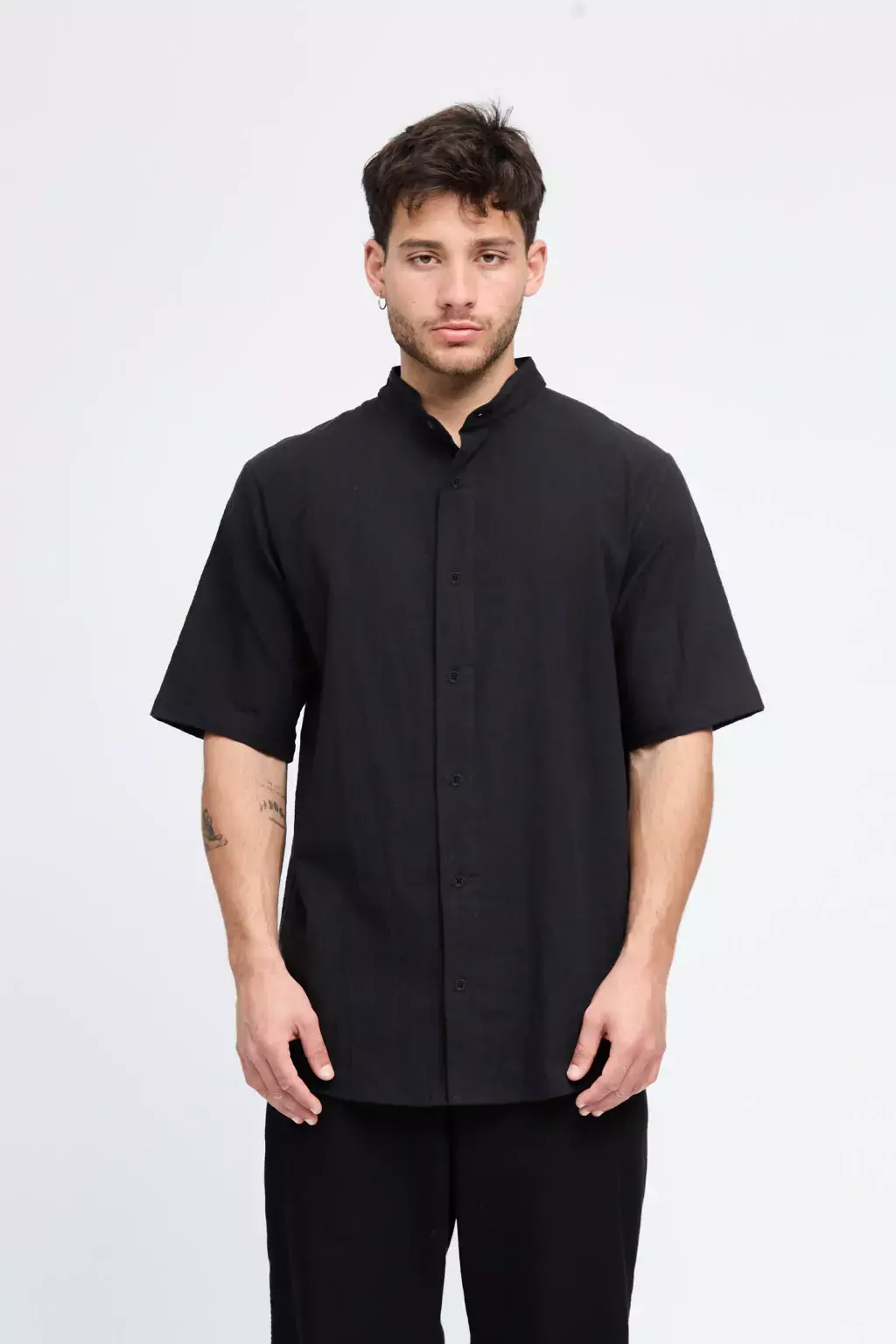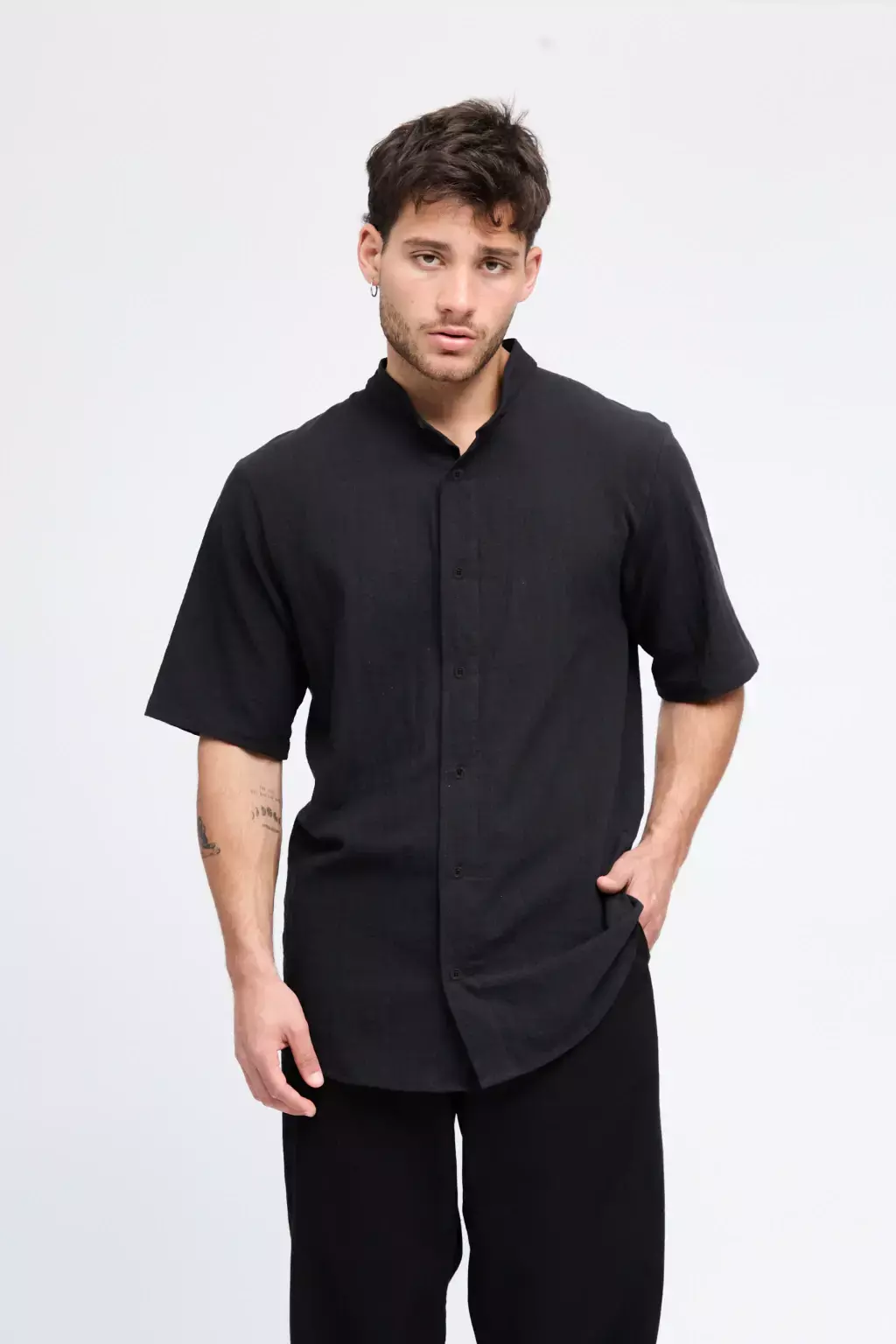 Camisa manga corta con cuello mao, confeccionada en simil lino. De textura fresca y liviana, con cierre de 5 botones a tono.