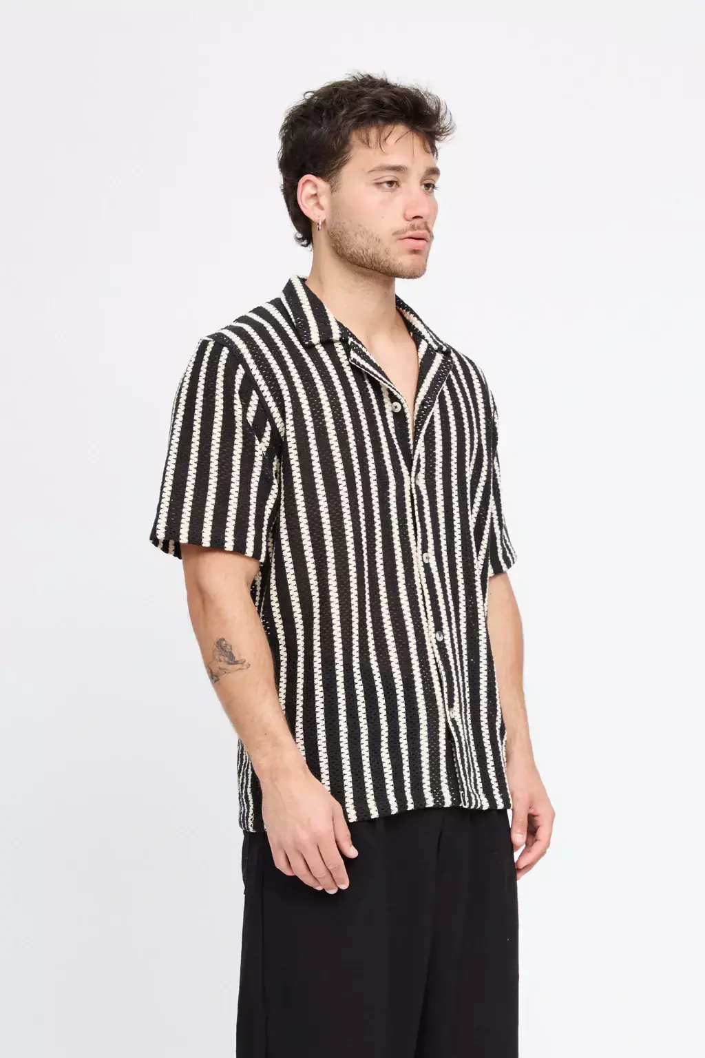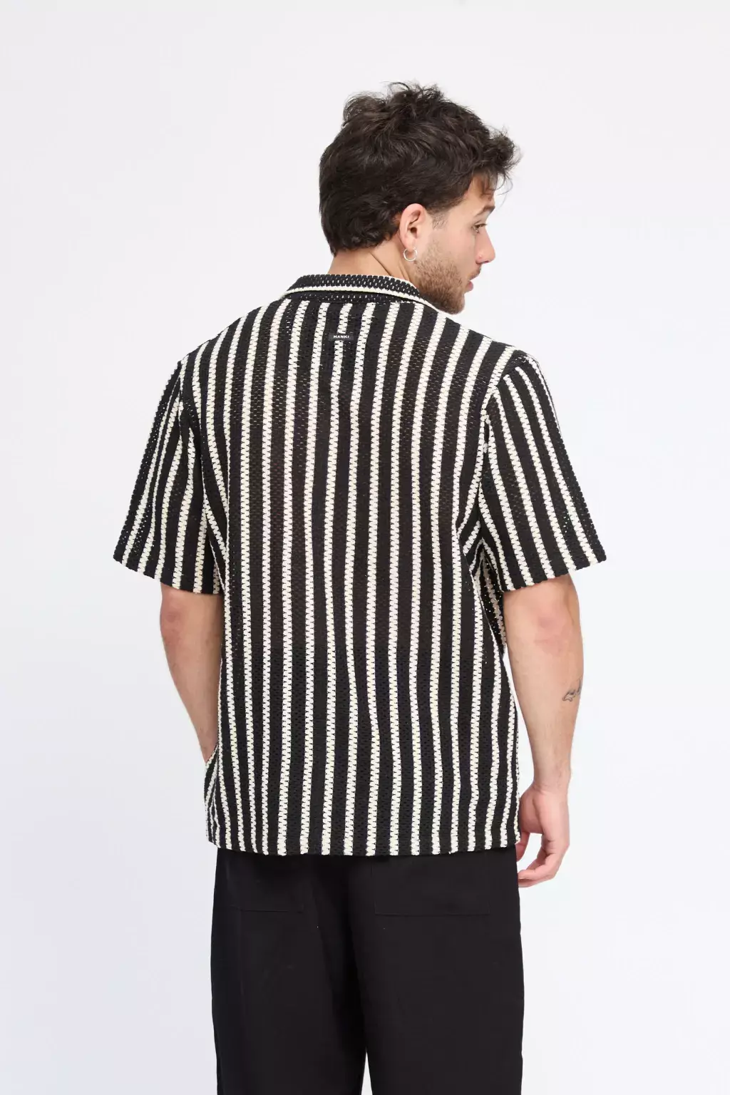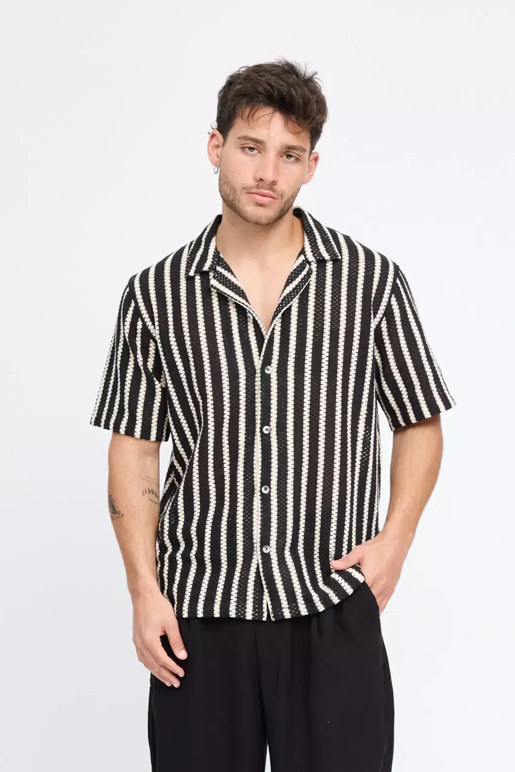 Camisa tejida de manga corta, calce regular. Confeccionada en 100% algodón, destaca por su diseño rayado y terminaciones de calidad con botones y etiquetas personalizados a tono.