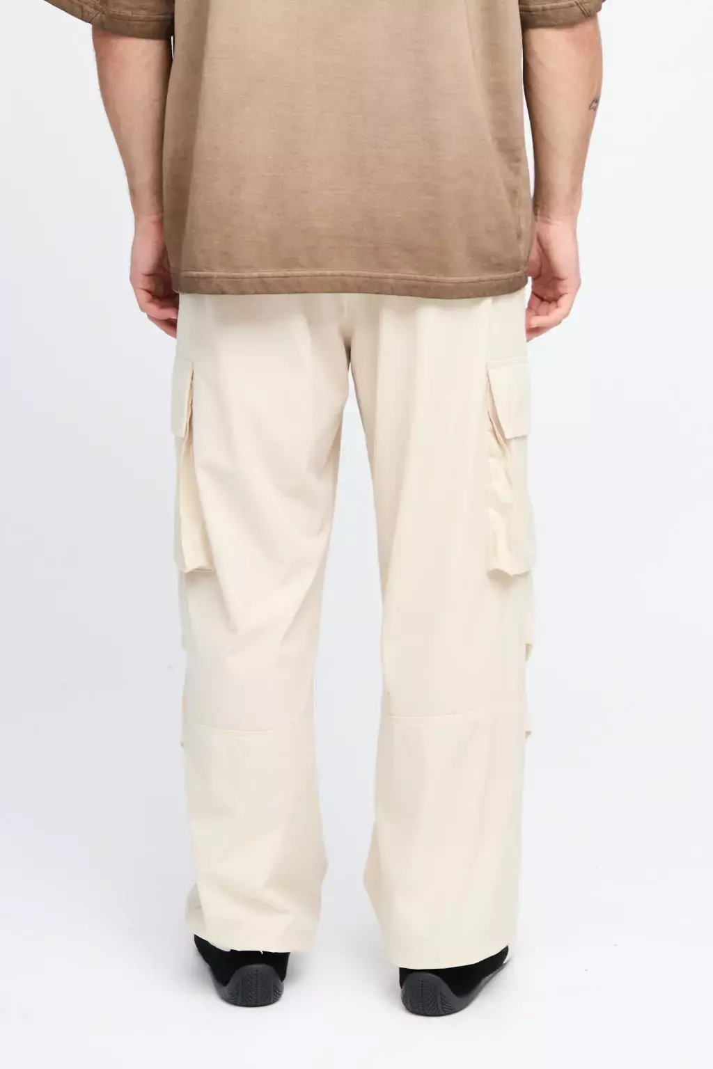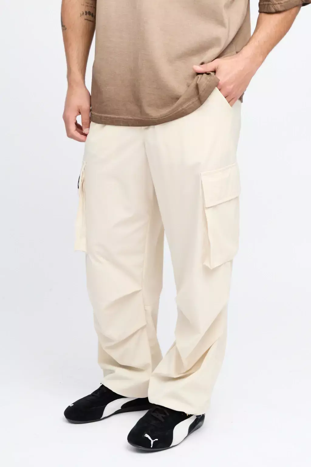 Pantalón parachute, con cintura elastizada. Dos bolsillos cargo laterales, bolsillos ojal traseros, pliegues laterales y puños con elástico y tanca para un calce cómodo y urbano.