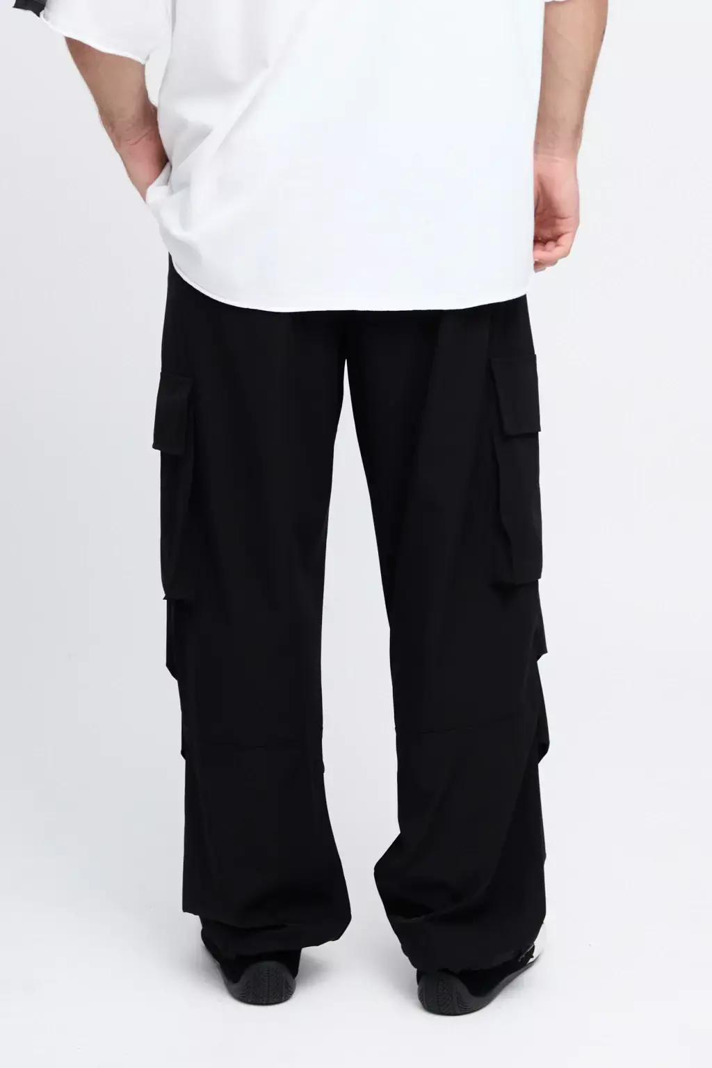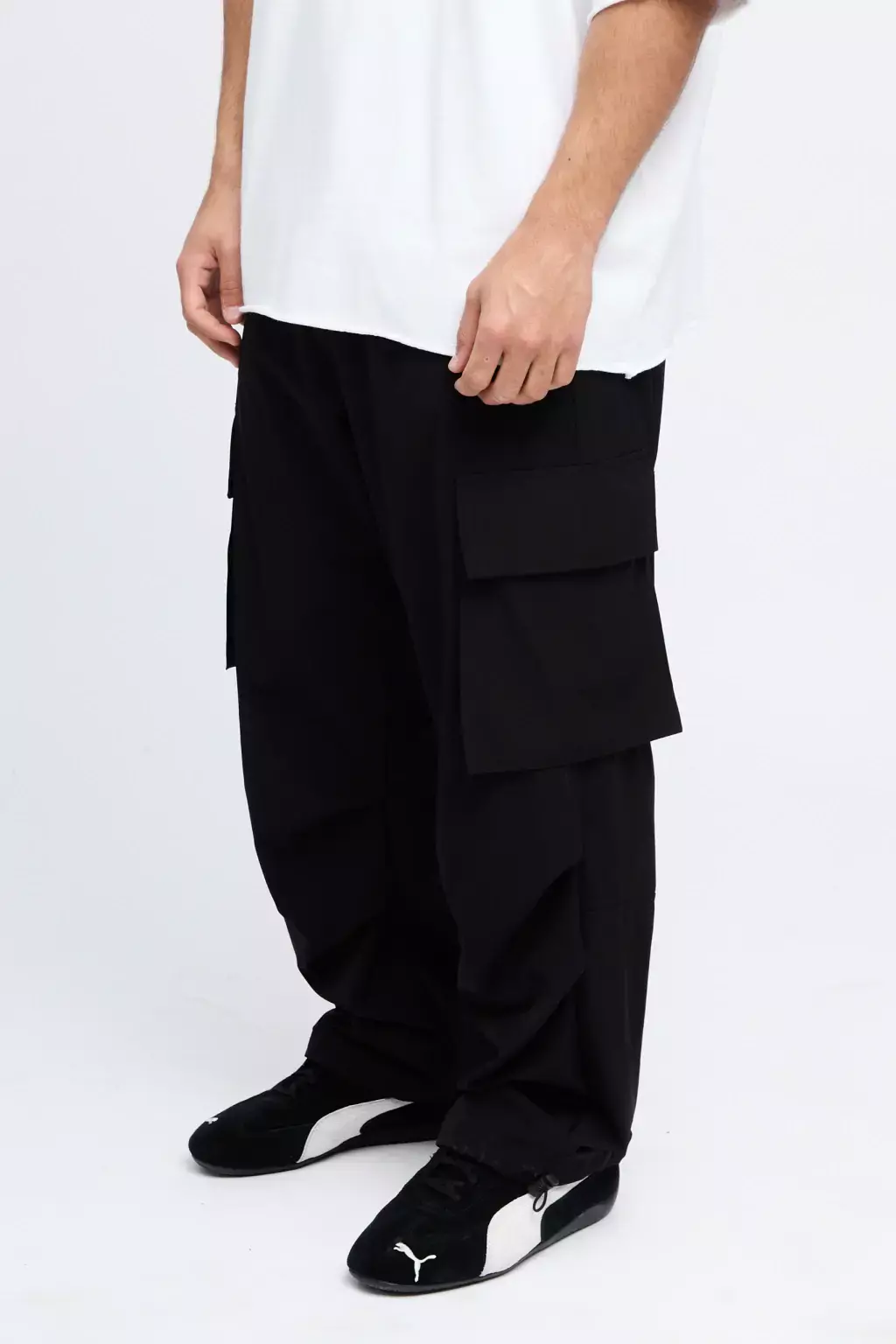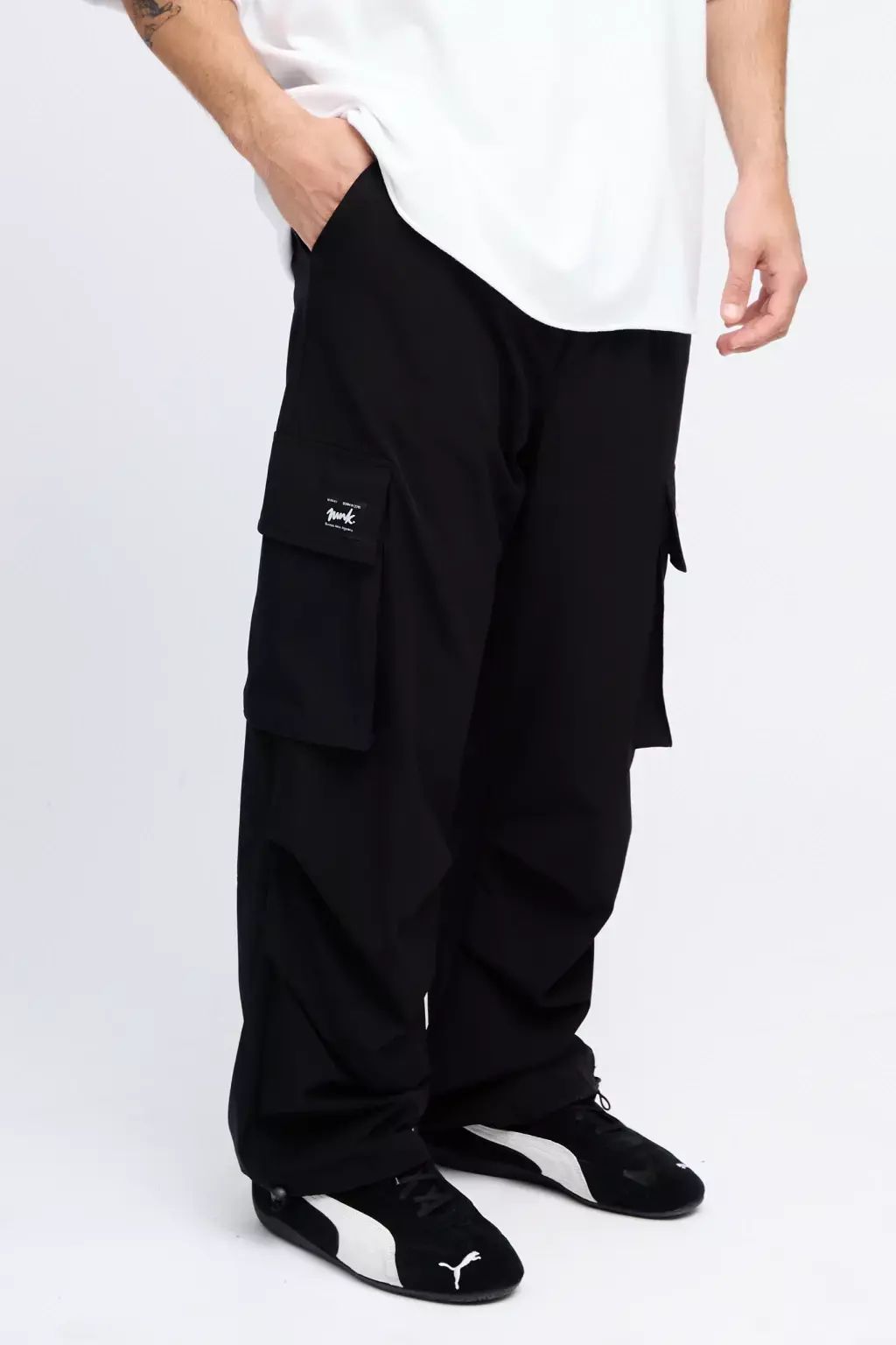 Pantalón parachute, con cintura elastizada. Dos bolsillos cargo laterales, bolsillos ojal traseros, pliegues laterales y puños con elástico y tanca para un calce cómodo y urbano.