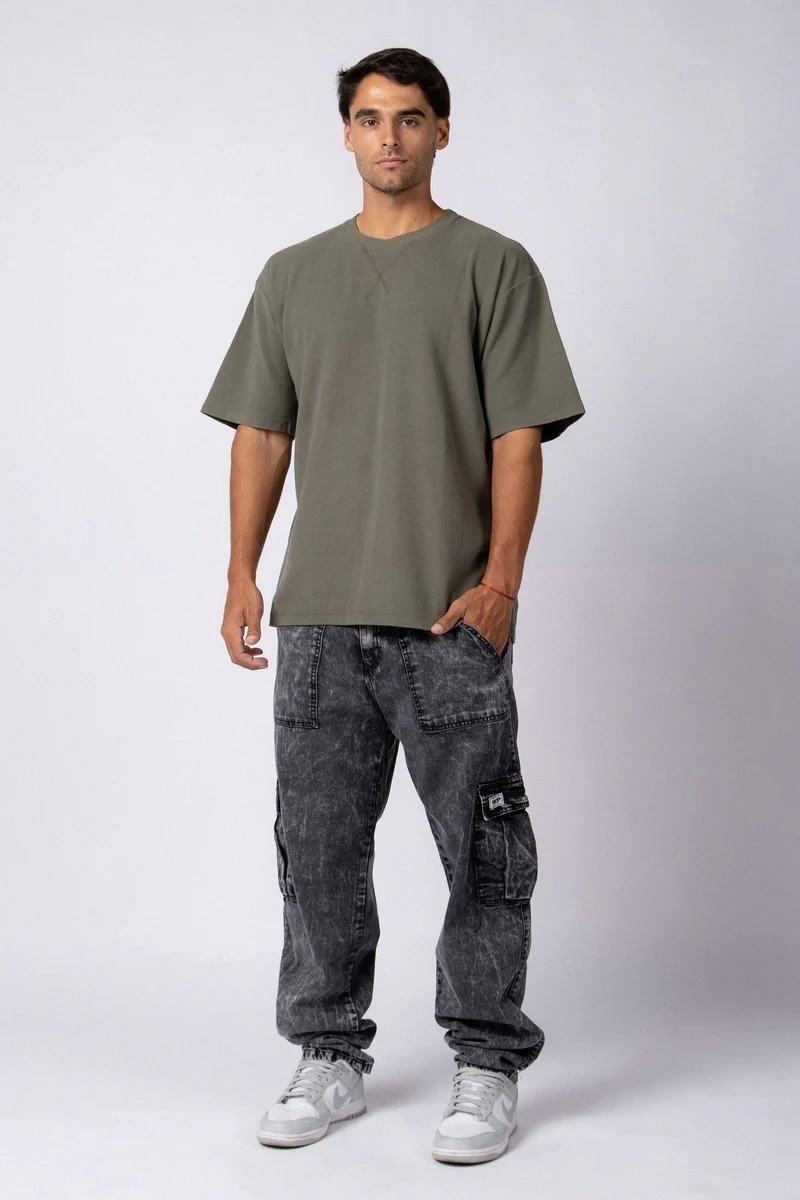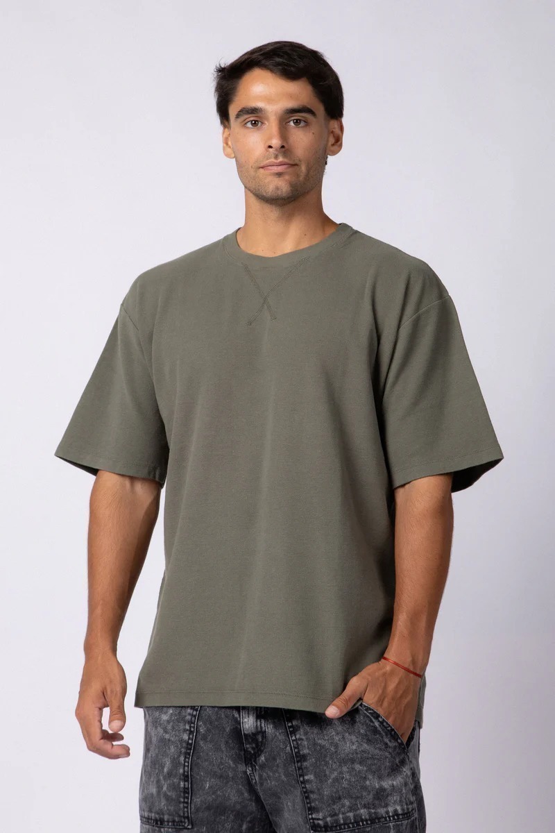 Remera lisa en tela micro panal. Detalles de bordador en escote. Calce oversize.